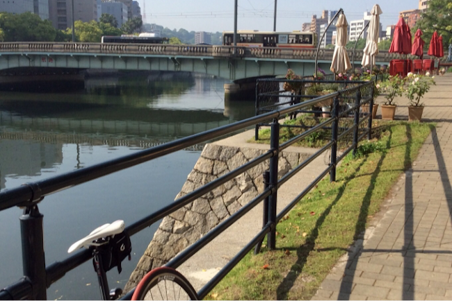 写真は自分の自転車と川の街広島。